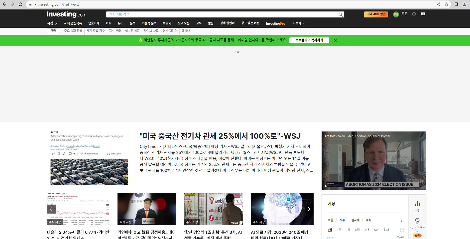 인베스팅닷컴(Investing.com)은 실시간 시세, 포트폴리오, 챠트, 최신 금융 뉴스, 실시간 주식시장 데이터를 무료로 제공하고 있습니다. 투자자들이 포트폴리오에 담은 종목 관련 뉴스와 글로벌 경
