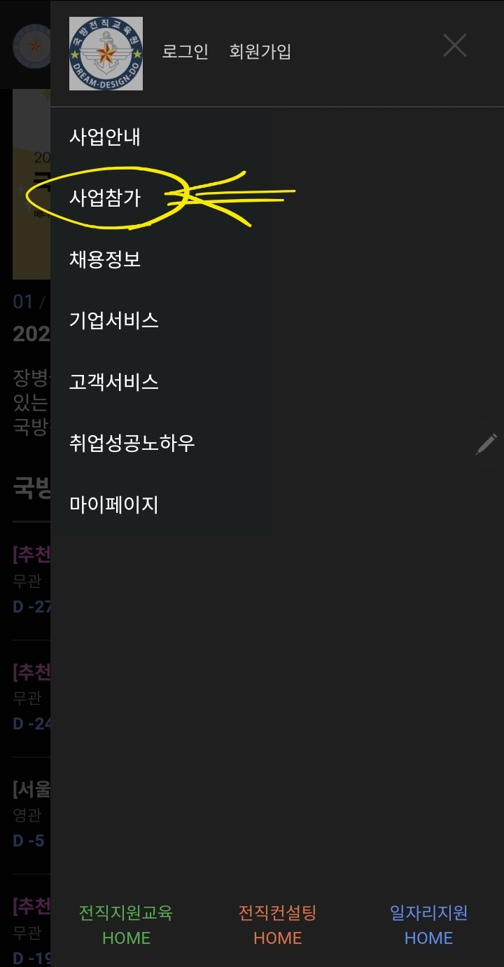 국방전직교육원 홈페이지에 들어가시면 이렇게 나오는데 [사업 안내] 부분에 [전직컨설팅] 으로 들어가시면